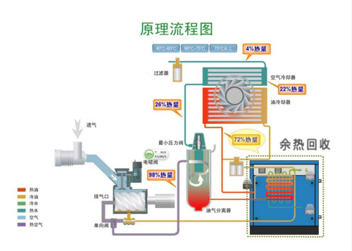 在以上過程中,高溫高壓的油、氣所攜帶的熱量大致相當(dāng)于空氣壓縮機(jī)功率的3/4其溫度通常在80℃—100℃之間。螺桿式空氣壓縮機(jī)通過其自身的散熱系統(tǒng)來給高 溫高壓的油、氣降溫的過程中,大量的熱能_被無端的浪費(fèi)了。
